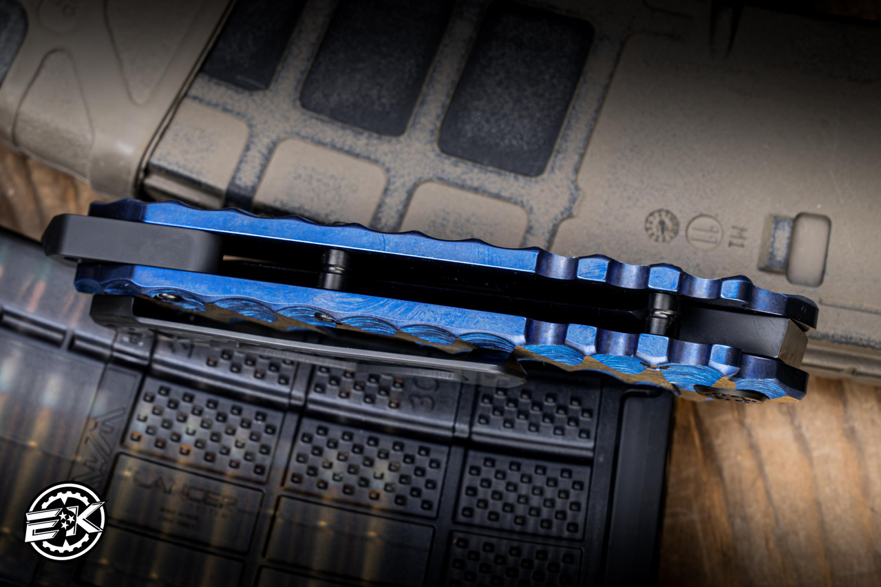 • Handle: 5.25" Blue w/ Bronze Flats "Lazy River" Sculpted Titanium