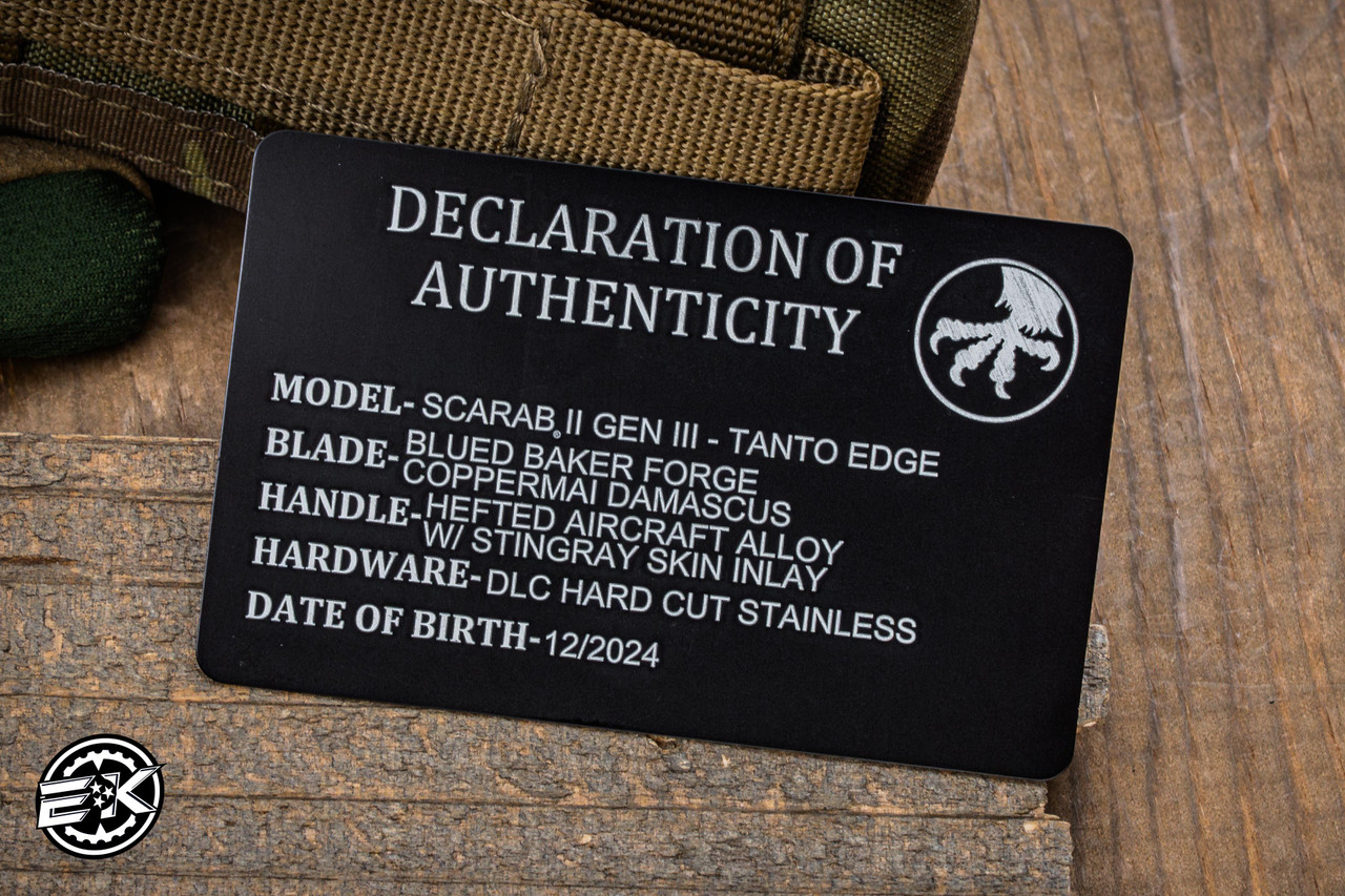 - Blade: 4" Tanto, Baker Forge Blued Copper Mai Damascus