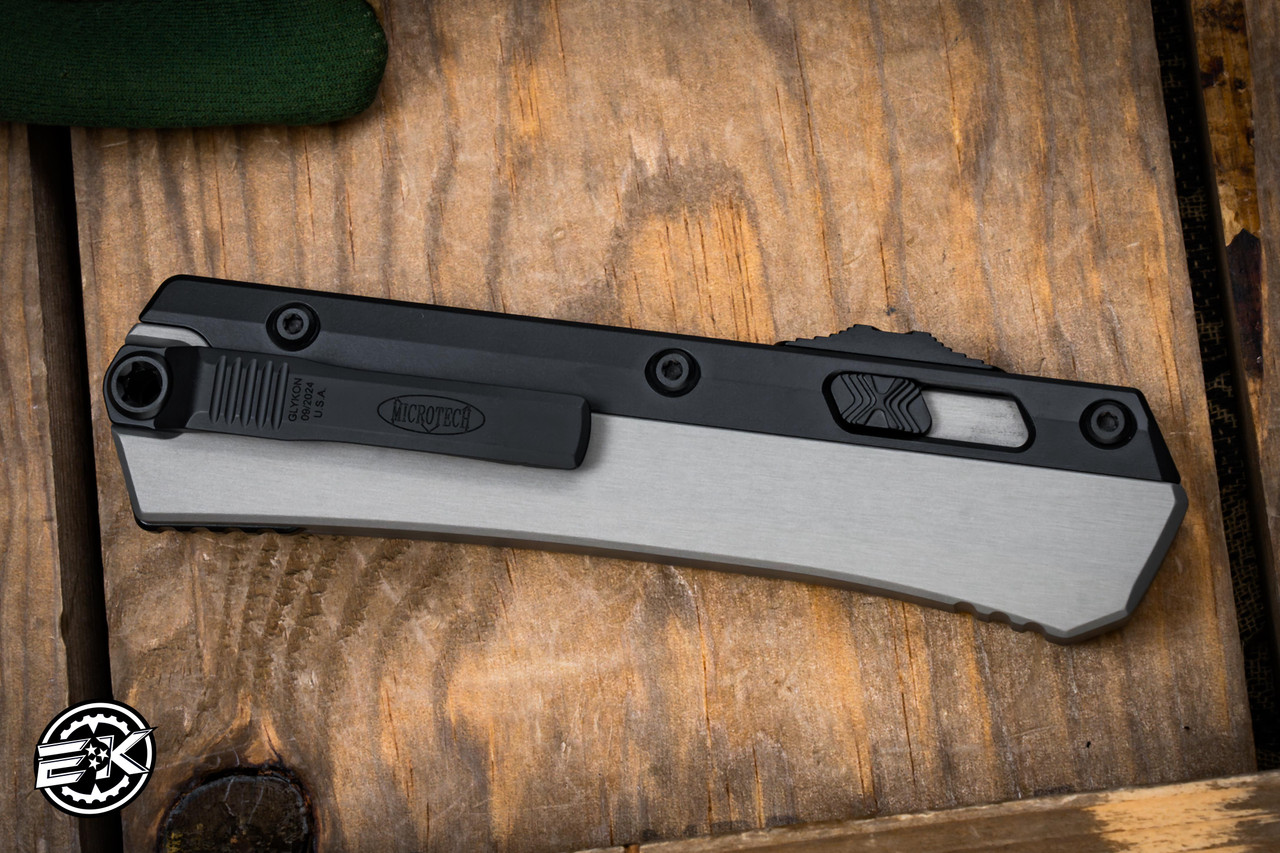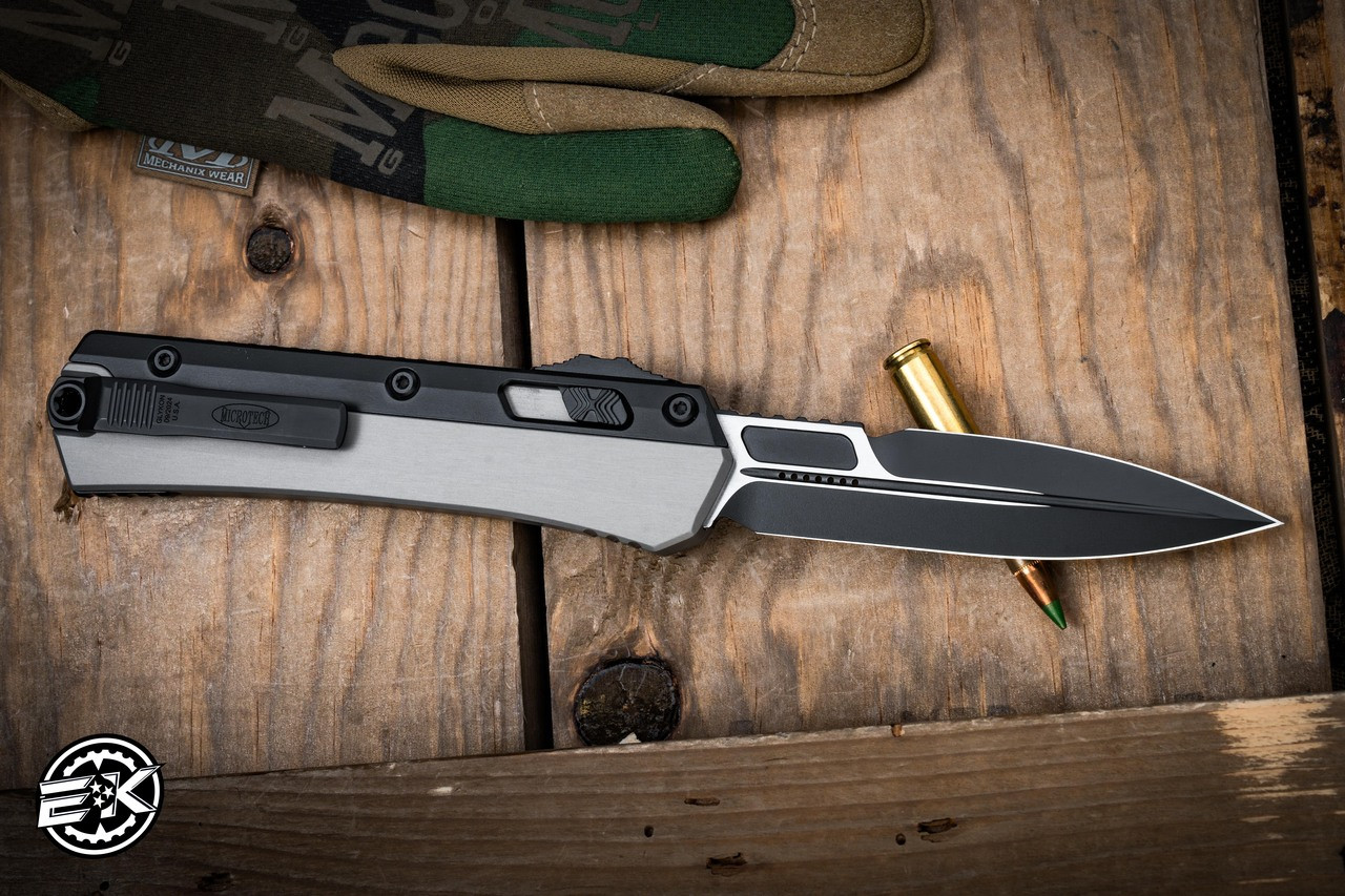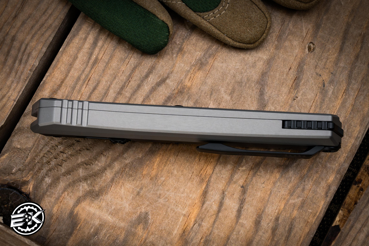 Description Overall: 8.8" Blade: 3.75" M390, Bayonet Double Edge, Black Handle: 5.2" Natural Clear Aluminum/ Titanium Action: Tri-Slide; OTF Automatic Nickel Boron Internals Weight: 5 oz Made in the USA Model: 184-1NC Video
