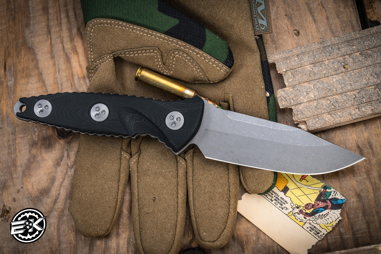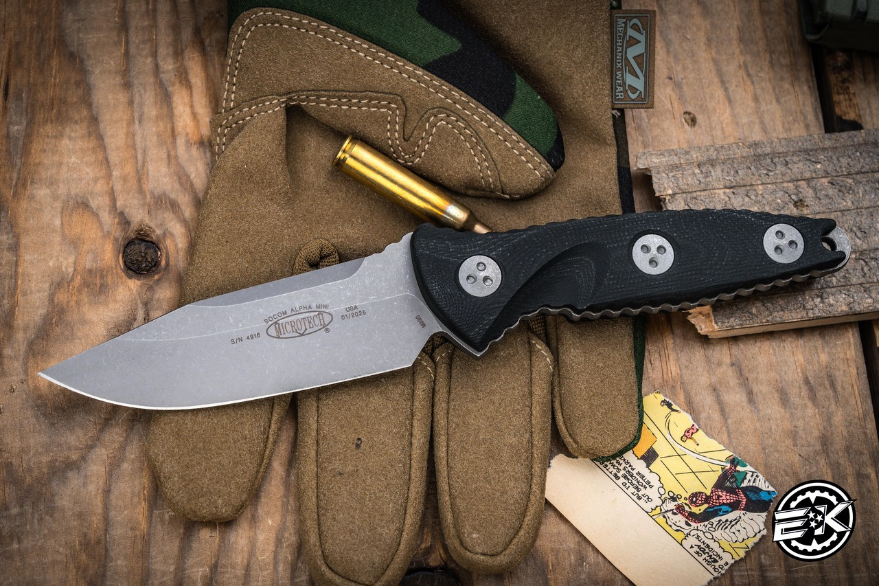 The Microtech Socom Alpha Mini is a fixed blade knife styled after the popular Microtech Socom folder. This fixed blade has a full-tang clip point blade in stonewash finish. The full-tang blade features notches around the edges for a more secure grip. Comes with a kydex Tek Lok sheath in laminate carbon fiber.