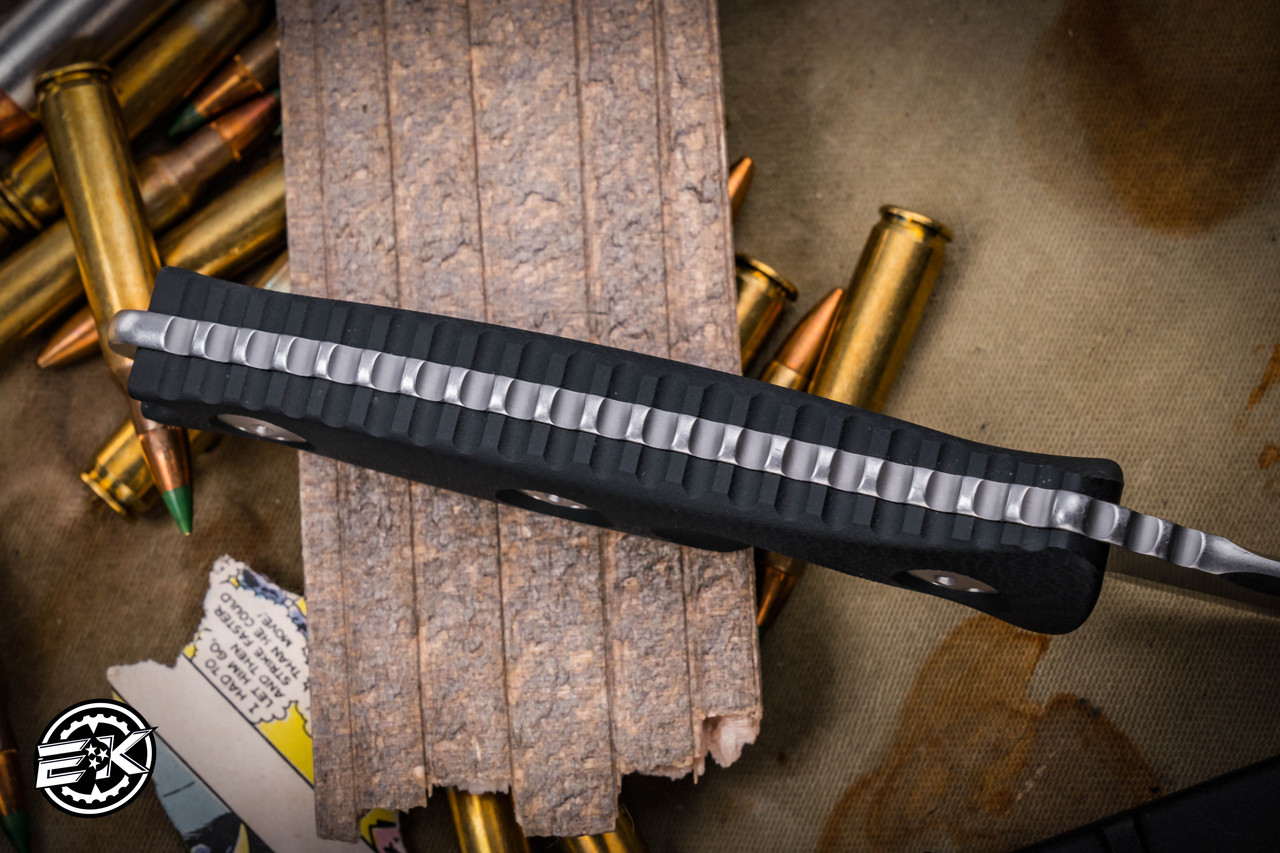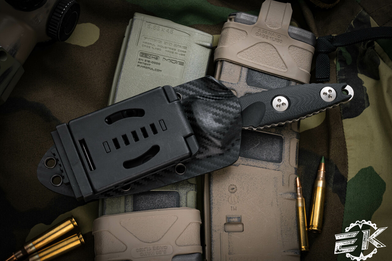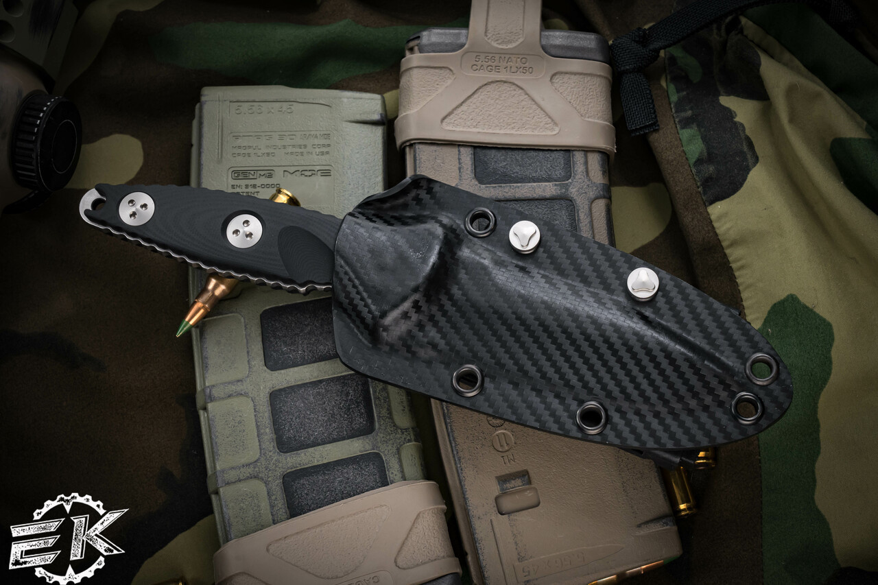 The Microtech Socom Alpha Mini is a fixed blade knife styled after the popular Microtech Socom folder. This fixed blade has a full-tang clip point blade in stonewash finish. The full-tang blade features notches around the edges for a more secure grip. Comes with a Kydex Tek-Lok Sheath in laminate carbon fiber.