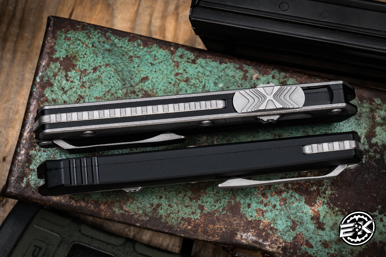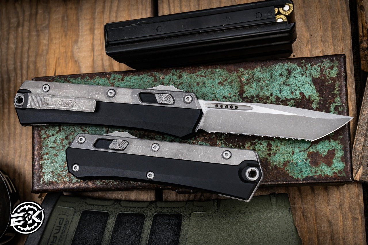 Microtech Glykon OTF Knife Aluminum/Titanium 3.75" Apocalyptic Tanto Stonewash Serrated 185-12AP